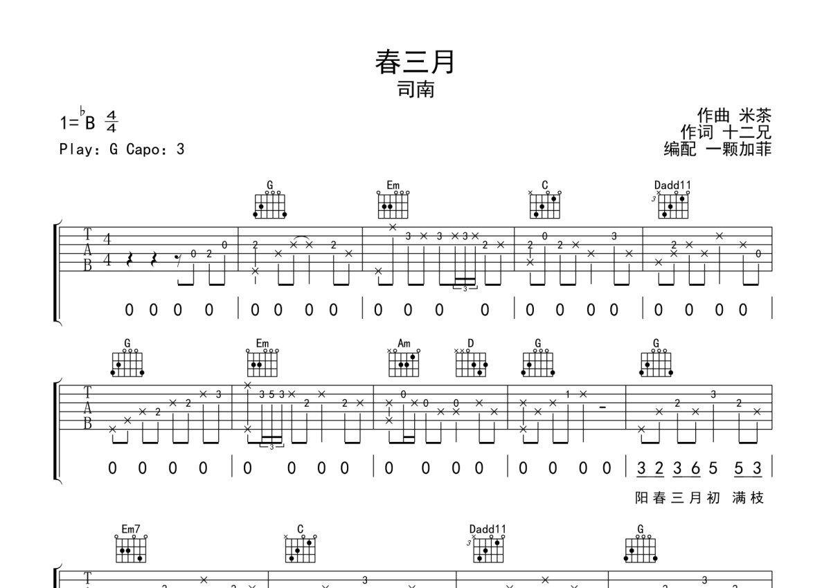 司南《春三月》吉他谱 - G调弹唱六线谱