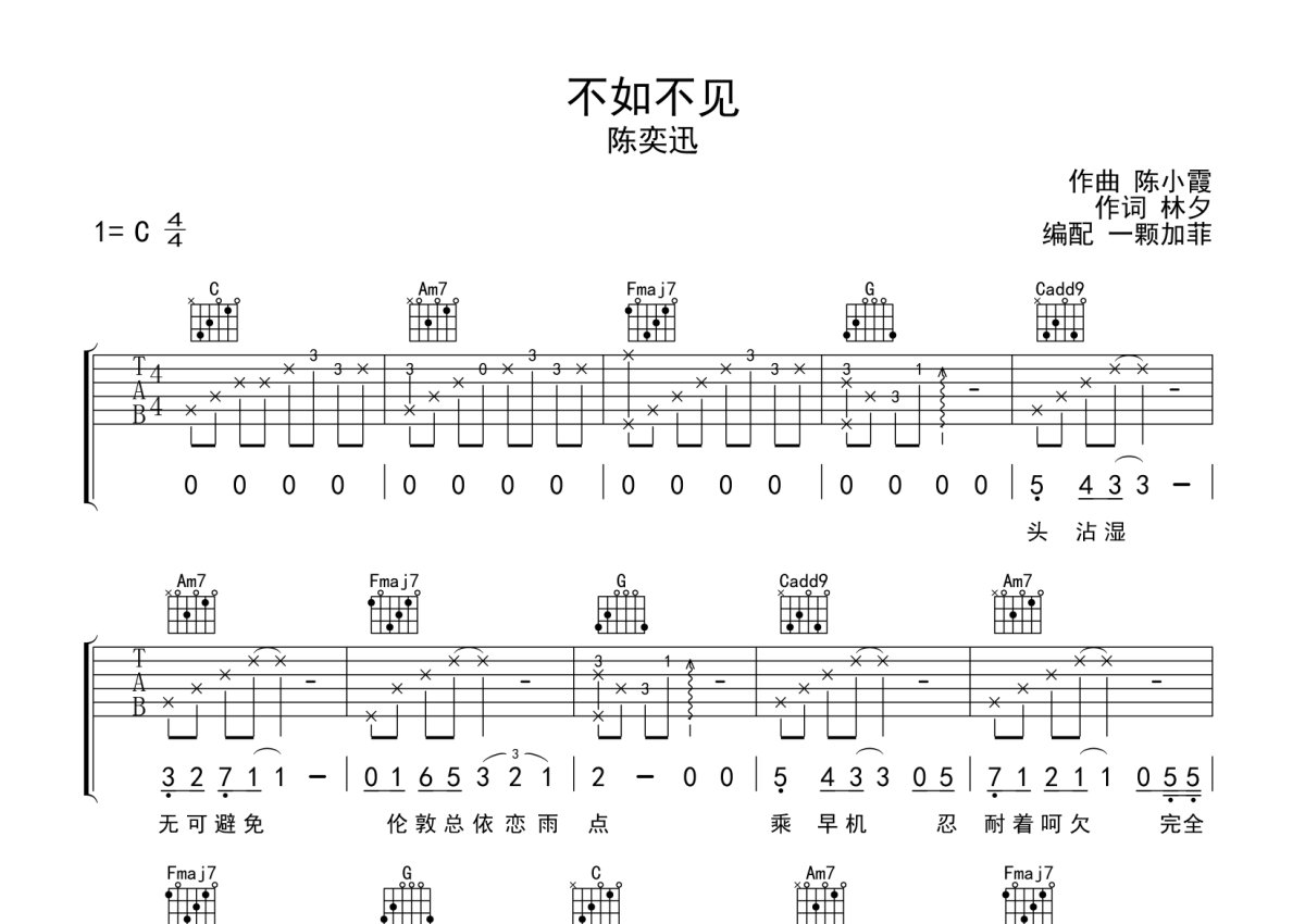 《不如不见》是陈奕迅演唱的一首歌曲,好久不见 粤语版,本吉他谱采用的是C调指法编配,这份吉他谱共有三张高清图谱,图谱由 @一颗加菲 编配上传,图谱使用六线谱编配,包含吉他和弦指法、简谱以及歌词部分,曲谱配备了相关的音频提供试听,使用这份不如不见吉他谱,可以让你更加方便地掌握这首歌曲的弹唱技巧,快来尝试吧。