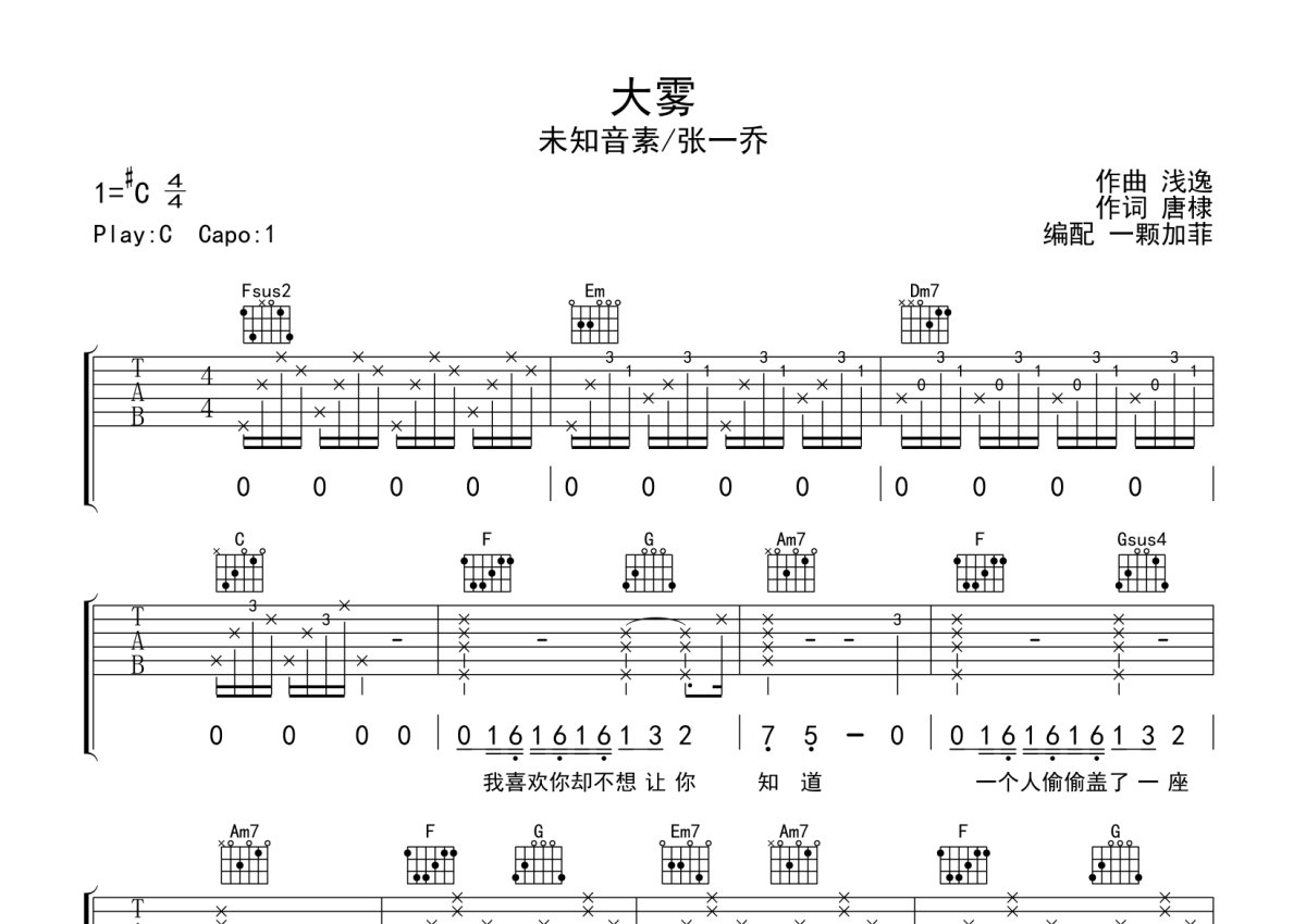 未知音素/张一乔《大雾》吉他谱 - C调弹唱六线谱 - 完整编配版