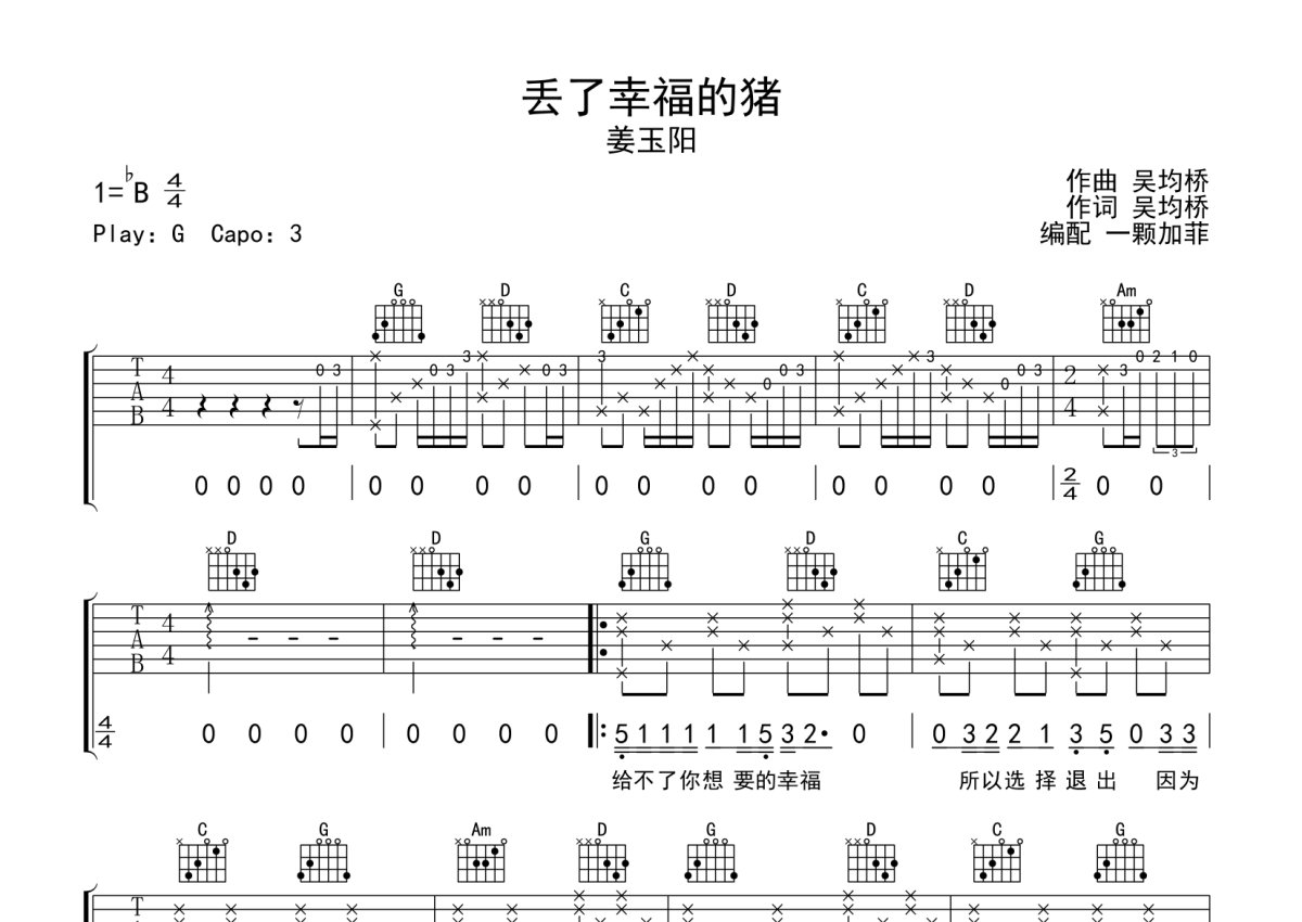 《丢了幸福的猪》是姜玉阳演唱的一首歌曲,完整编配版,本吉他谱采用的是G调指法编配,这份吉他谱共有三张高清图谱,图谱由 @一颗加菲 编配上传,图谱使用六线谱编配,包含吉他和弦指法、简谱以及歌词部分,曲谱配备了相关的音频提供试听,使用这份丢了幸福的猪吉他谱,可以让你更加方便地掌握这首歌曲的弹唱技巧,快来尝试吧。