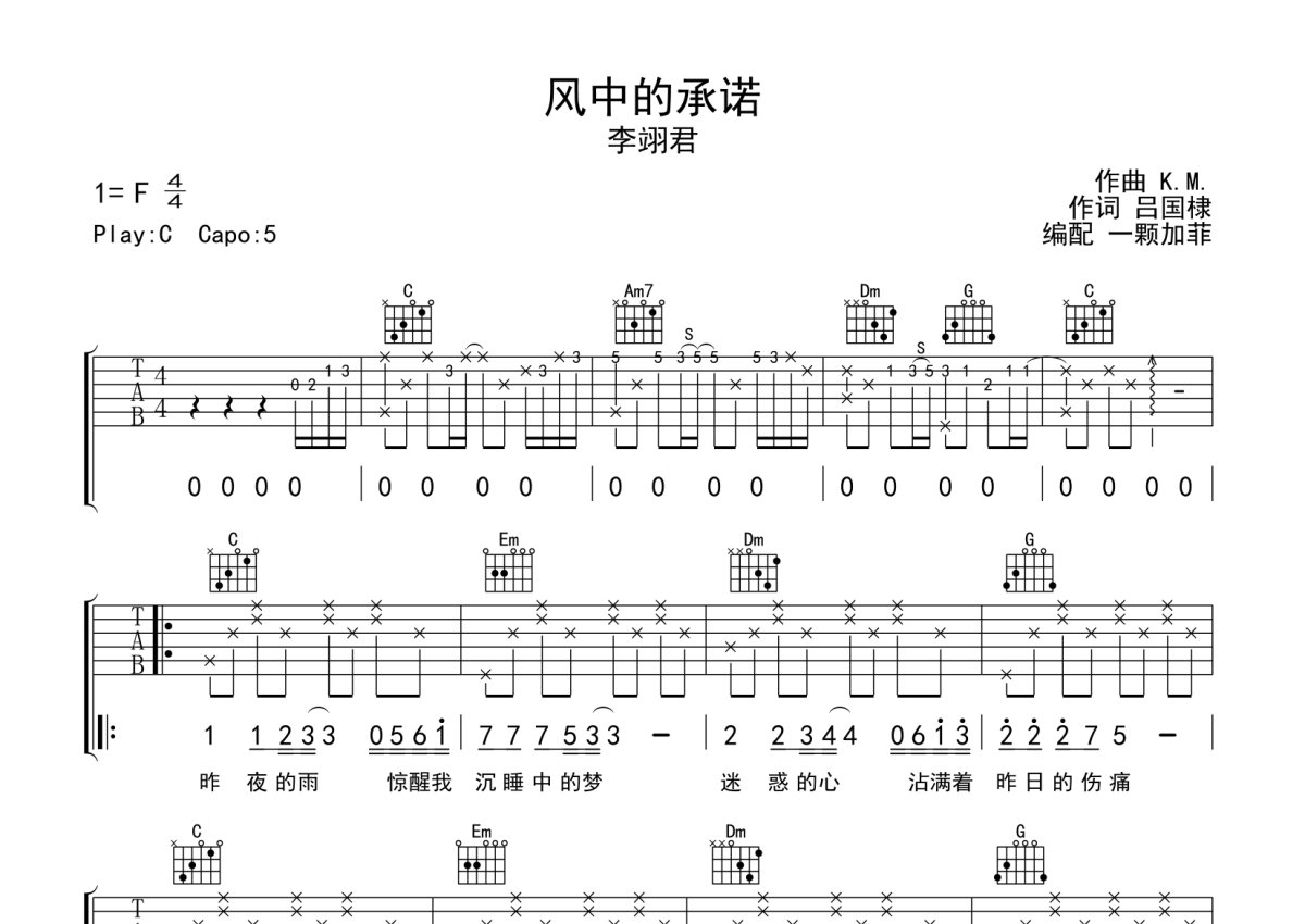 李翊君《风中的承诺》吉他谱 - C调弹唱六线谱 - 完整编配版