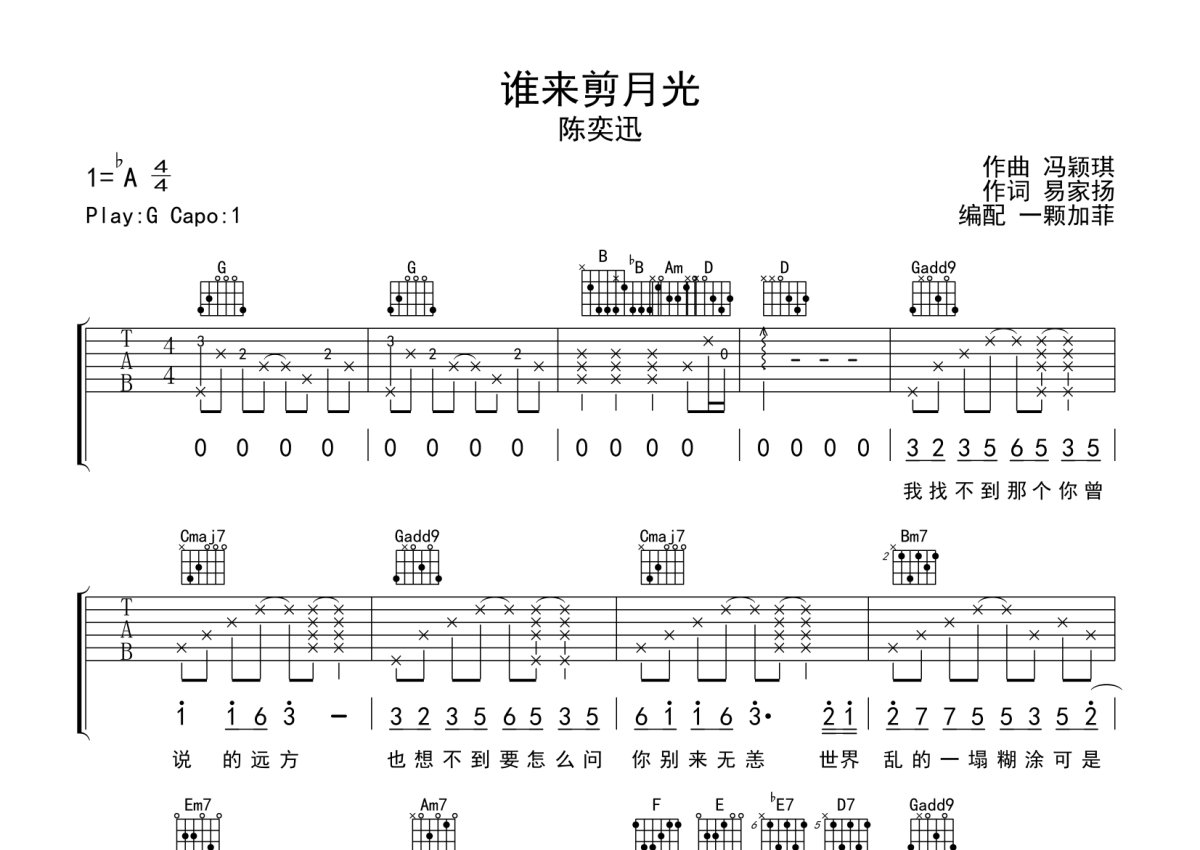 陈奕迅《谁来剪月光》吉他谱 - G调弹唱六线谱 - 完整编配版