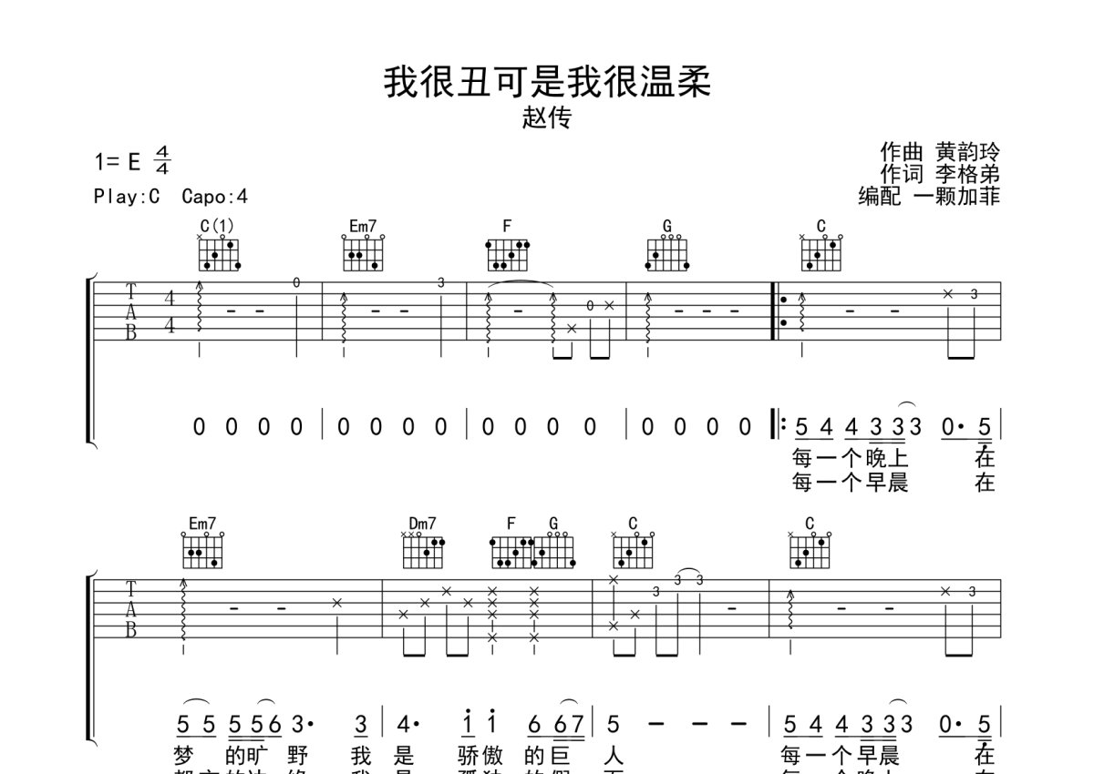 《我很丑可是我很温柔》是赵传演唱的一首歌曲,完整编配版,本吉他谱采用的是C调指法编配,这份吉他谱共有三张高清图谱,图谱由 @一颗加菲 编配上传,图谱使用六线谱编配,包含吉他和弦指法、简谱以及歌词部分,曲谱配备了相关的音频提供试听,使用这份我很丑可是我很温柔吉他谱,可以让你更加方便地掌握这首歌曲的弹唱技巧,快来尝试吧。