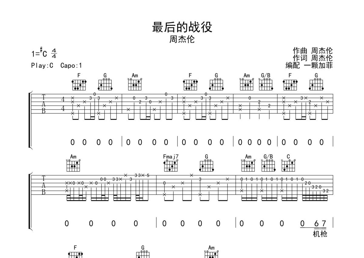 周杰伦《最后的战役》吉他谱 - C调弹唱六线谱 - 完整编配版