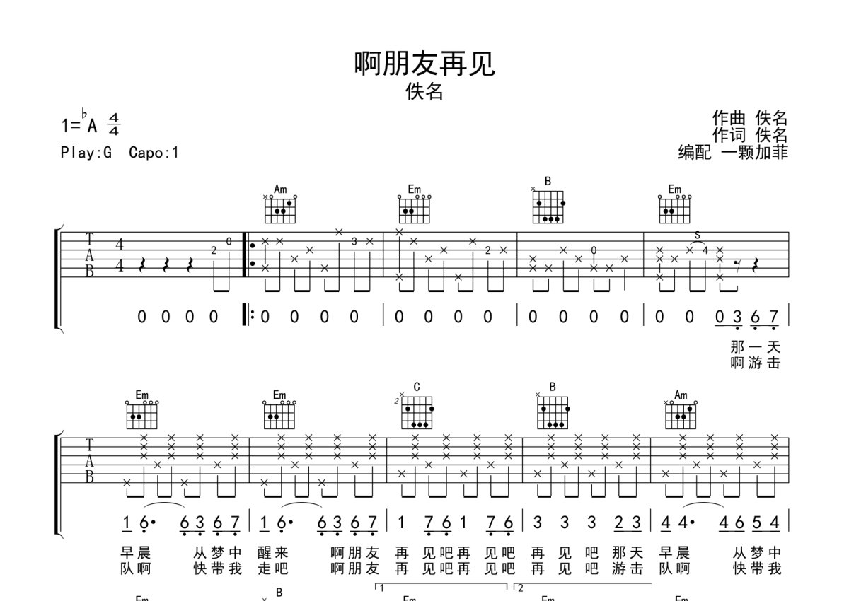 《啊朋友再见》是佚名演唱的一首歌曲,完整编配版,本吉他谱采用的是G调指法编配,这份吉他谱共有三张高清图谱,图谱由 @一颗加菲 编配上传,图谱使用六线谱编配,包含吉他和弦指法、简谱以及歌词部分,曲谱配备了相关的音频提供试听,使用这份啊朋友再见吉他谱,可以让你更加方便地掌握这首歌曲的弹唱技巧,快来尝试吧。