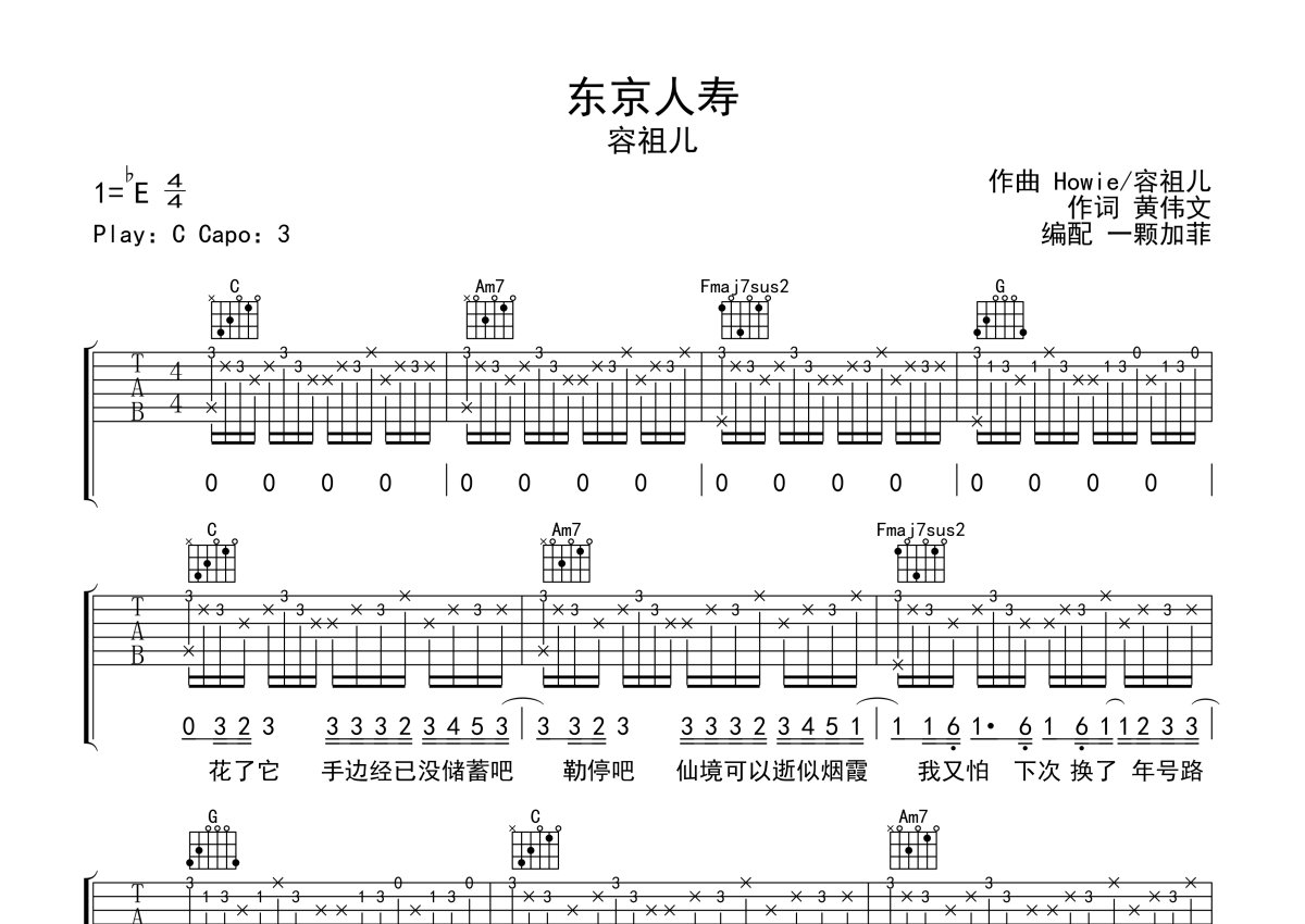 孙燕姿《东京人寿》吉他谱 - C调弹唱六线谱