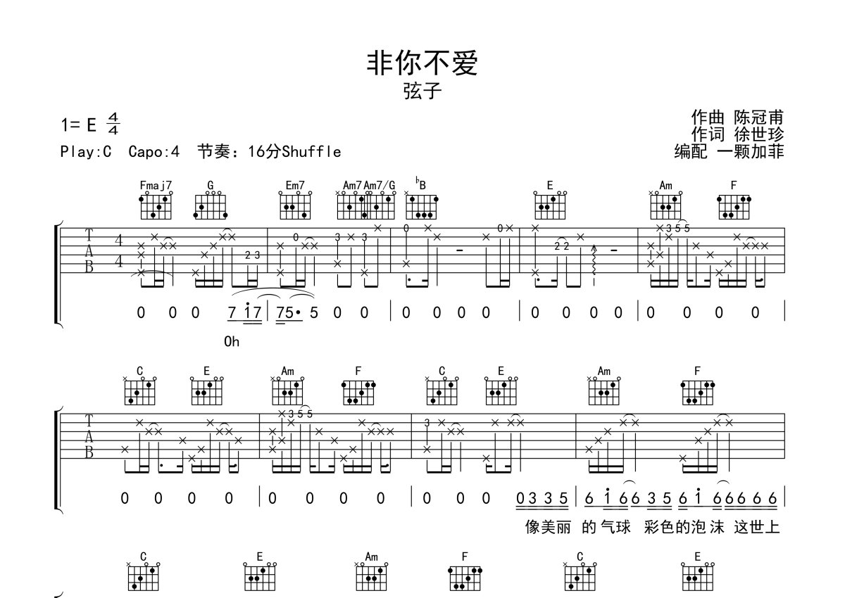 弦子《非你不爱》吉他谱 - C调弹唱六线谱