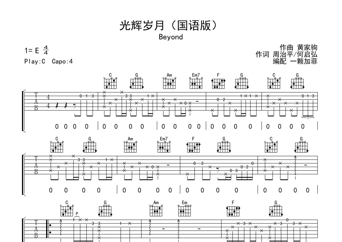 Beyond《光辉岁月》吉他谱 - C调弹唱六线谱