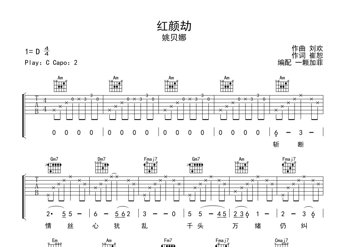 《红颜劫》是姚贝娜演唱的一首歌曲,本吉他谱采用的是C调指法编配,这份吉他谱共有两张高清图谱,图谱由 @一颗加菲 编配上传,图谱使用六线谱编配,包含吉他和弦指法、简谱以及歌词部分,曲谱配备了相关的音频提供试听,使用这份红颜劫吉他谱,可以让你更加方便地掌握这首歌曲的弹唱技巧,快来尝试吧。