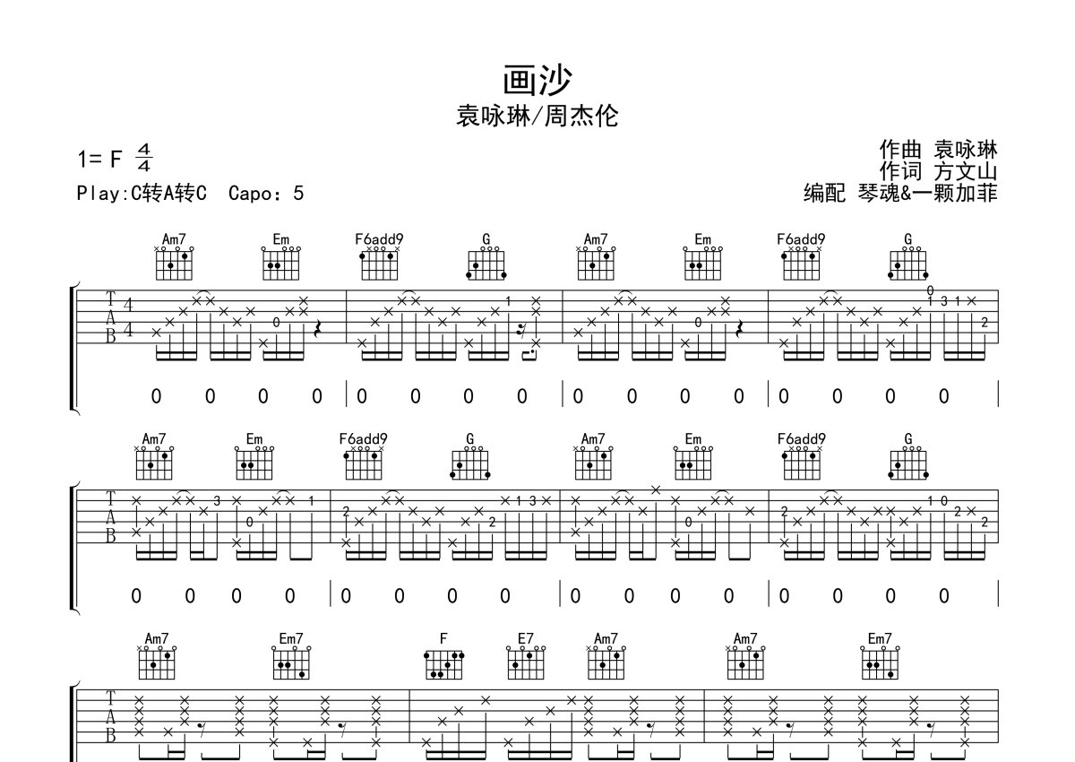 周杰伦《画沙》吉他谱 - C调弹唱六线谱