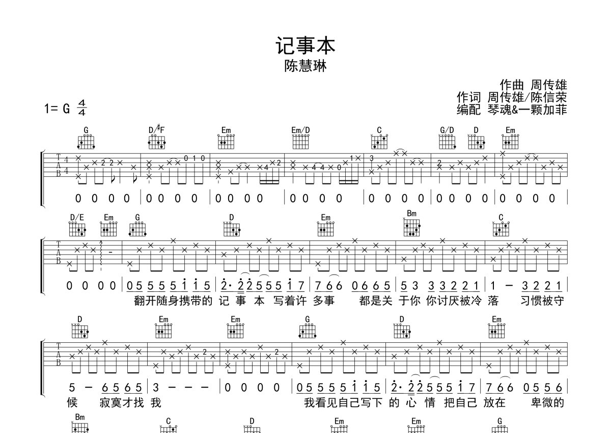 陈慧琳《记事本》吉他谱 - G调弹唱六线谱