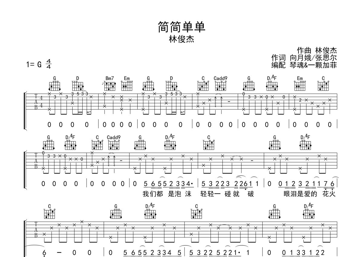 林俊杰《简简单单》吉他谱 - G调弹唱六线谱