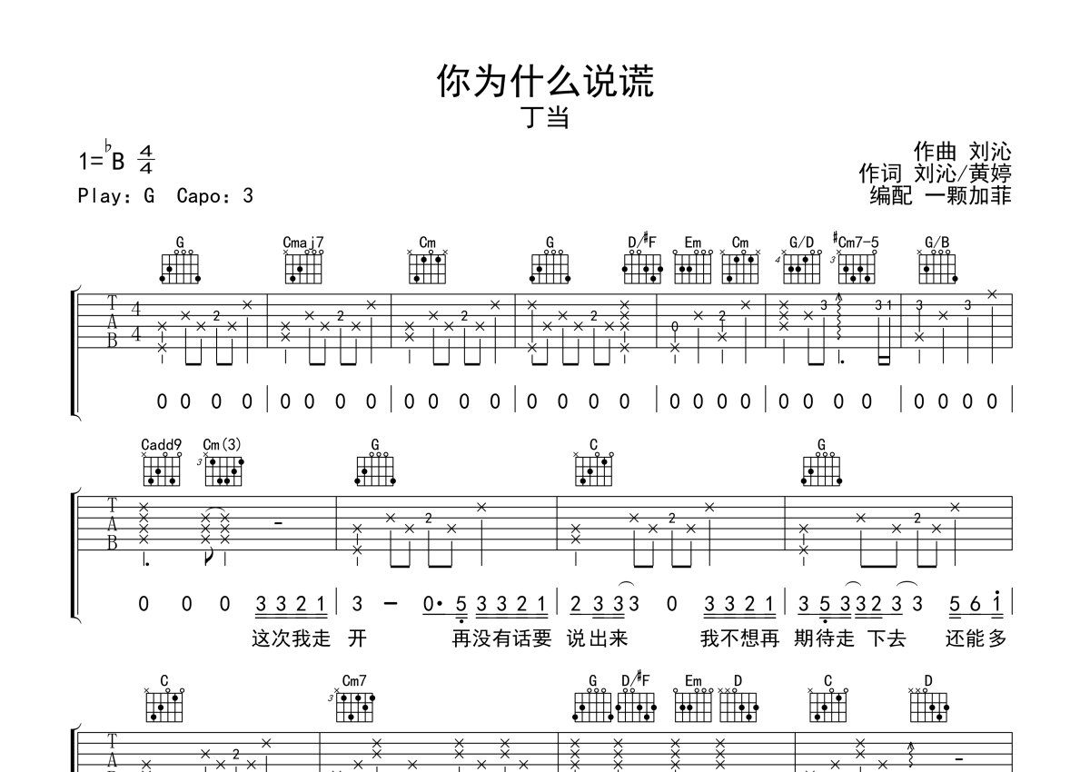 《你为什么说谎》是丁当演唱的一首歌曲,本吉他谱采用的是G调指法编配,这份吉他谱共有四张高清图谱,图谱由 @一颗加菲 编配上传,图谱使用六线谱编配,包含吉他和弦指法、简谱以及歌词部分,曲谱配备了相关的音频提供试听,使用这份你为什么说谎吉他谱,可以让你更加方便地掌握这首歌曲的弹唱技巧,快来尝试吧。