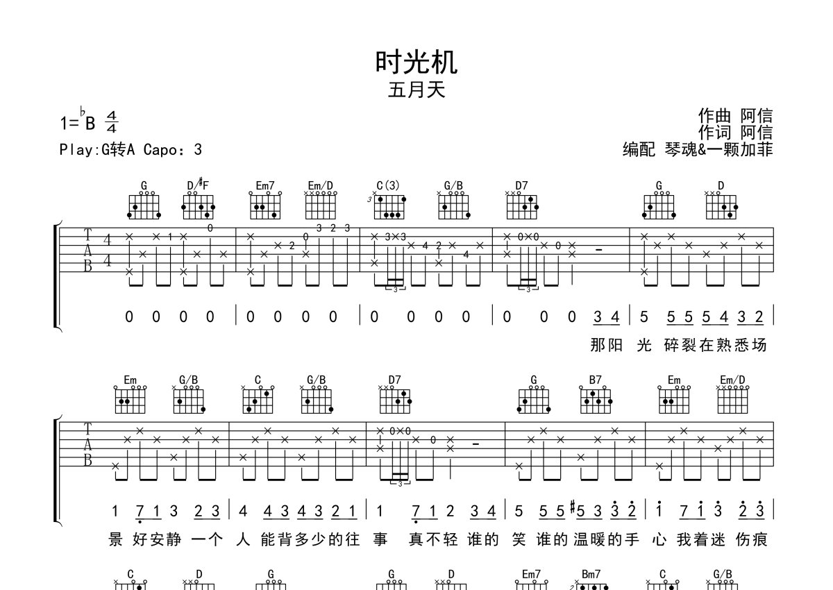 《时光机》是五月天演唱的一首歌曲,本吉他谱采用的是G调指法编配,这份吉他谱共有三张高清图谱,图谱由 @一颗加菲 编配上传,图谱使用六线谱编配,包含吉他和弦指法、简谱以及歌词部分,曲谱配备了相关的音频提供试听,使用这份时光机吉他谱,可以让你更加方便地掌握这首歌曲的弹唱技巧,快来尝试吧。