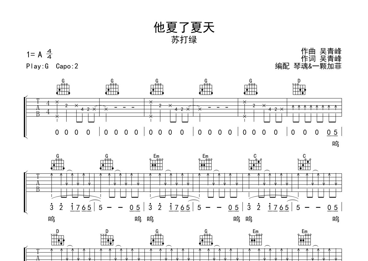 苏打绿《他夏了夏天》吉他谱 - G调弹唱六线谱