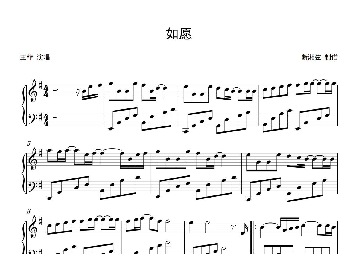 《如愿》是王菲演唱的一首歌曲,这份钢琴谱共有三张高清图谱,图谱由 @月隐云先知 编配上传,曲谱配备了相关的音频提供试听,使用这份如愿钢琴谱,可以让你更加方便地掌握这首歌曲的演奏技巧,快来尝试吧。王菲《如愿》钢琴谱。