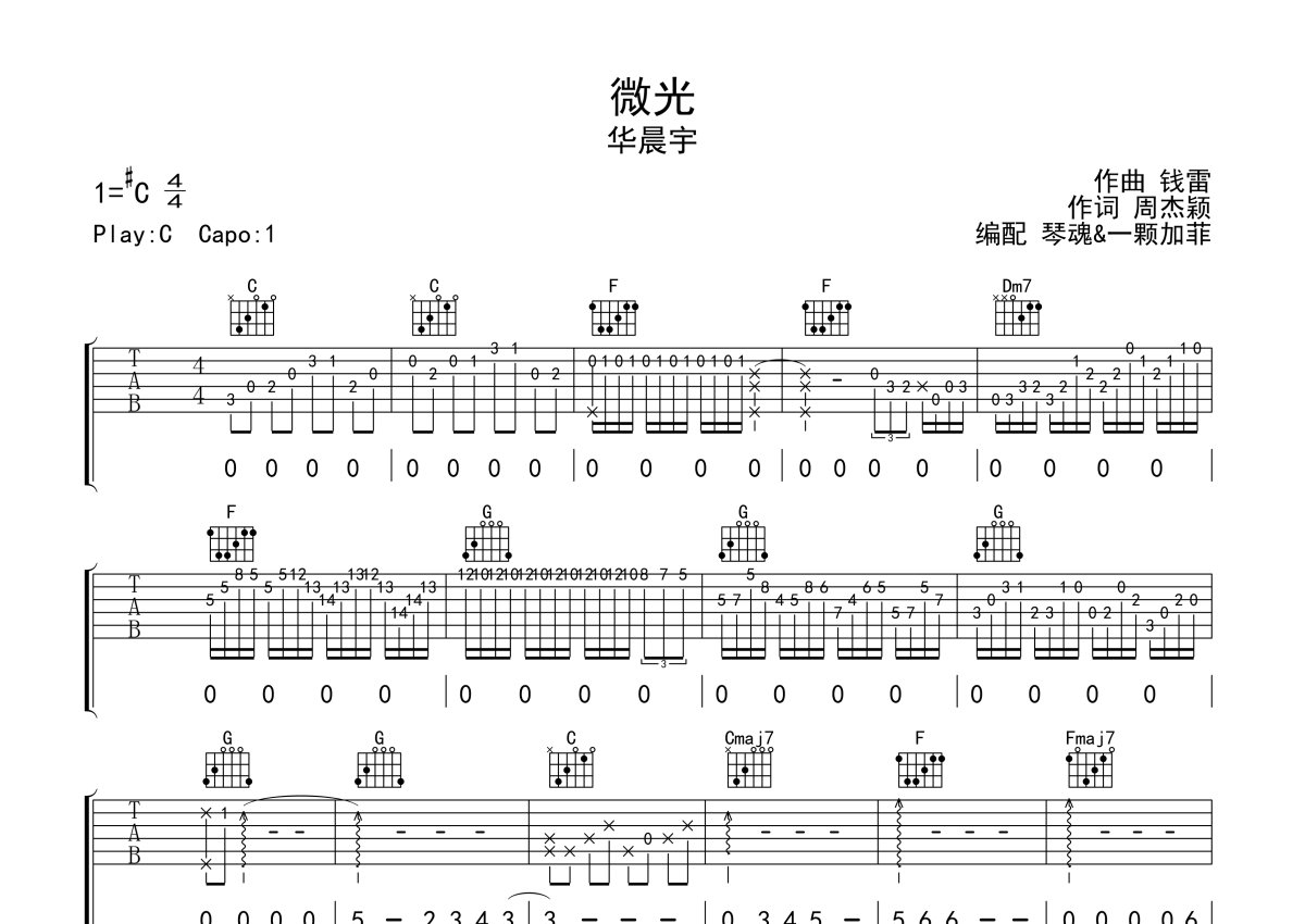 华晨宇《微光》吉他谱 - C调弹唱六线谱