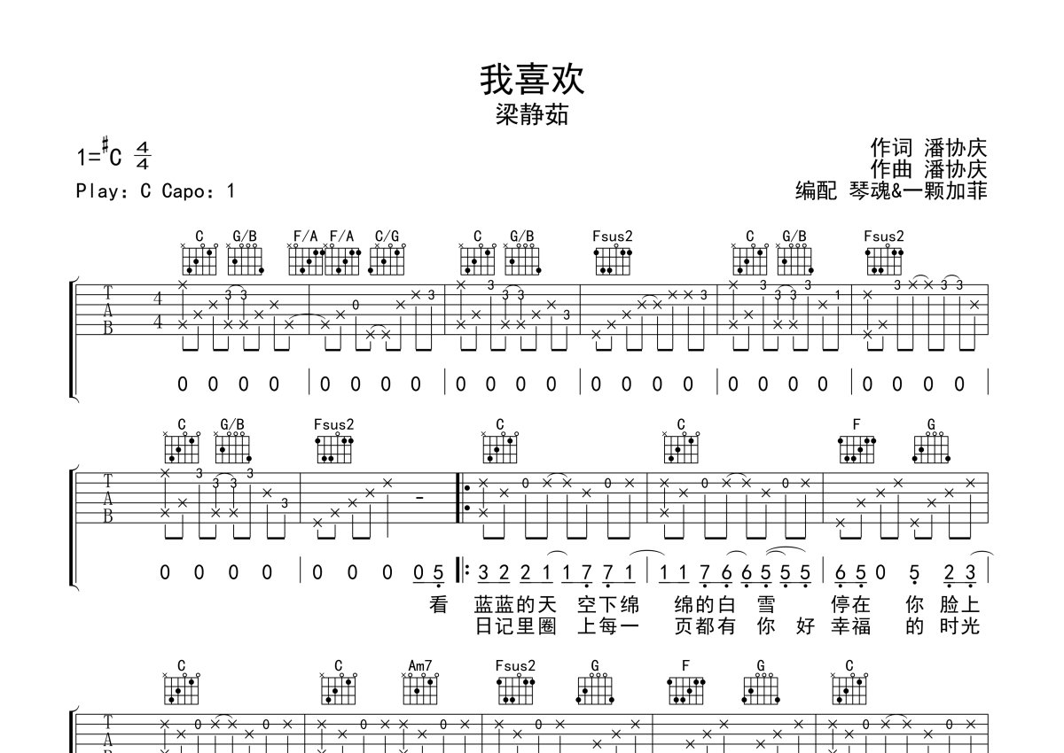梁静茹《我喜欢》吉他谱 - C调弹唱六线谱