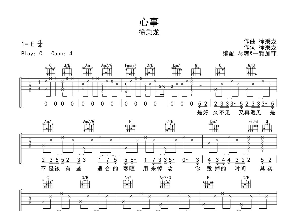 徐秉龙《心事》吉他谱 - C调弹唱六线谱