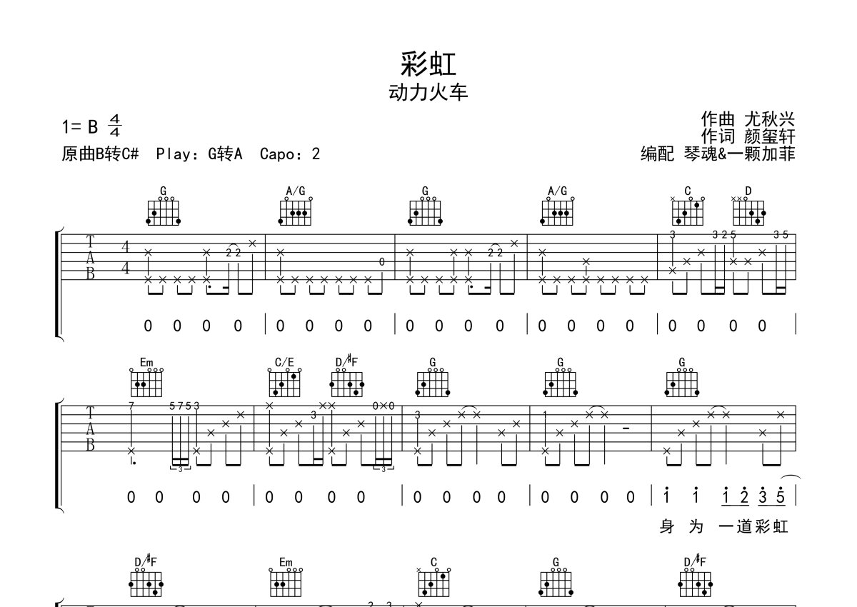 《彩虹》是动力火车演唱的一首歌曲,本吉他谱采用的是G调指法编配,这份吉他谱共有四张高清图谱,图谱由 @一颗加菲 编配上传,图谱使用六线谱编配,包含吉他和弦指法、简谱以及歌词部分,曲谱配备了相关的音频提供试听,使用这份彩虹吉他谱,可以让你更加方便地掌握这首歌曲的弹唱技巧,快来尝试吧。