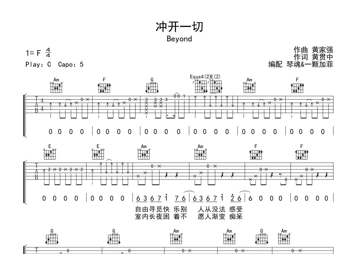 Beyond《冲开一切》吉他谱 - C调弹唱六线谱