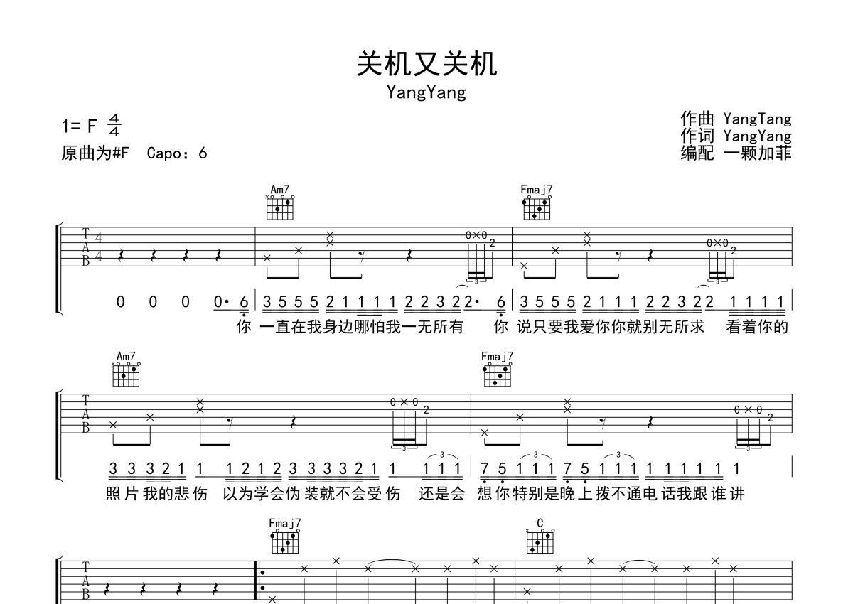 YangYang《关机又关机》吉他谱 - C调弹唱六线谱