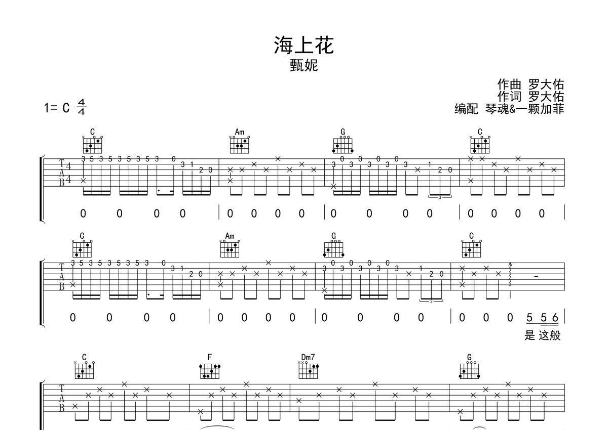 甄妮《海上花》吉他谱 - C调弹唱六线谱