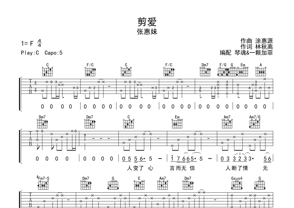 张惠妹《剪爱》吉他谱 - C调弹唱六线谱