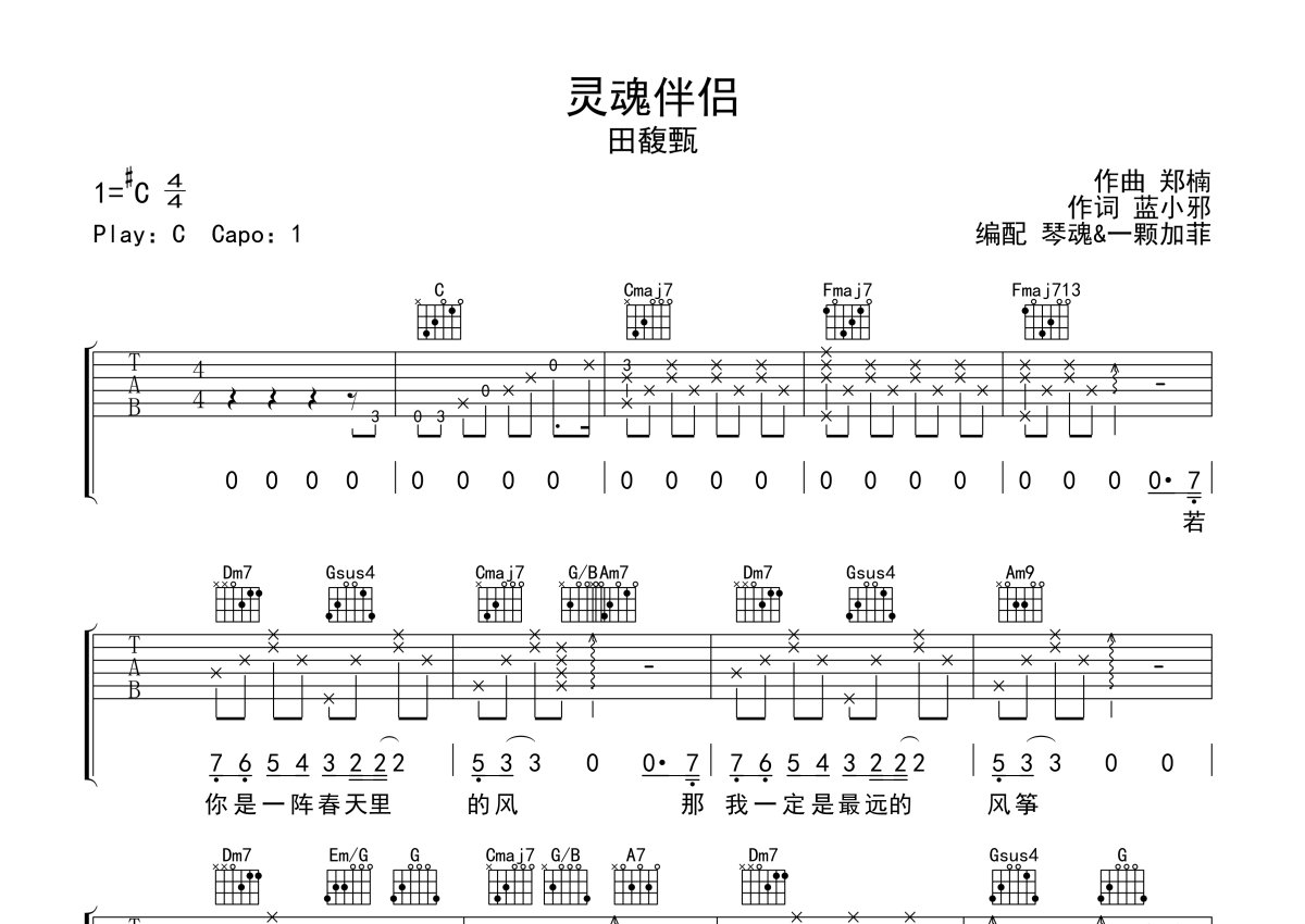 《灵魂伴侣》是田馥甄演唱的一首歌曲,本吉他谱采用的是C调指法编配,这份吉他谱共有三张高清图谱,图谱由 @一颗加菲 编配上传,图谱使用六线谱编配,包含吉他和弦指法、简谱以及歌词部分,曲谱配备了相关的音频提供试听,使用这份灵魂伴侣吉他谱,可以让你更加方便地掌握这首歌曲的弹唱技巧,快来尝试吧。