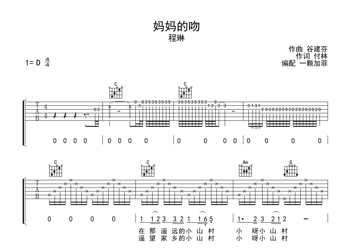 《妈妈的吻》是程琳演唱的一首歌曲,本吉他谱采用的是C调指法编配,这份吉他谱共有两张高清图谱,图谱由 @一颗加菲 编配上传,图谱使用六线谱编配,包含吉他和弦指法、简谱以及歌词部分,曲谱配备了相关的音频提供试听,使用这份妈妈的吻吉他谱,可以让你更加方便地掌握这首歌曲的弹唱技巧,快来尝试吧。