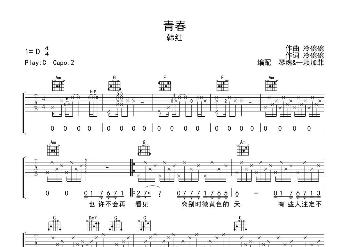 韩红《青春》吉他谱 - C调弹唱六线谱