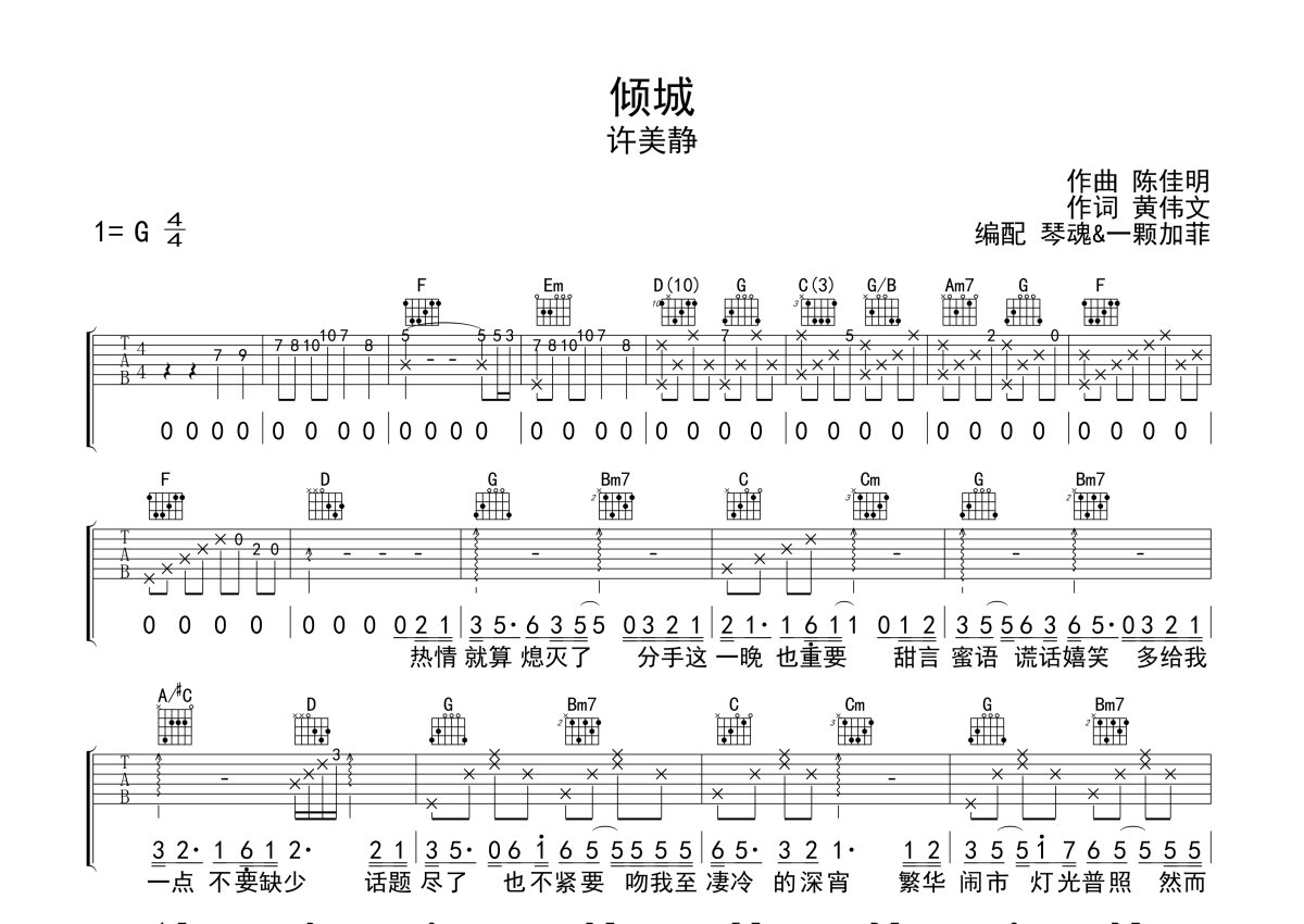 许美静《倾城》吉他谱 - G调弹唱六线谱