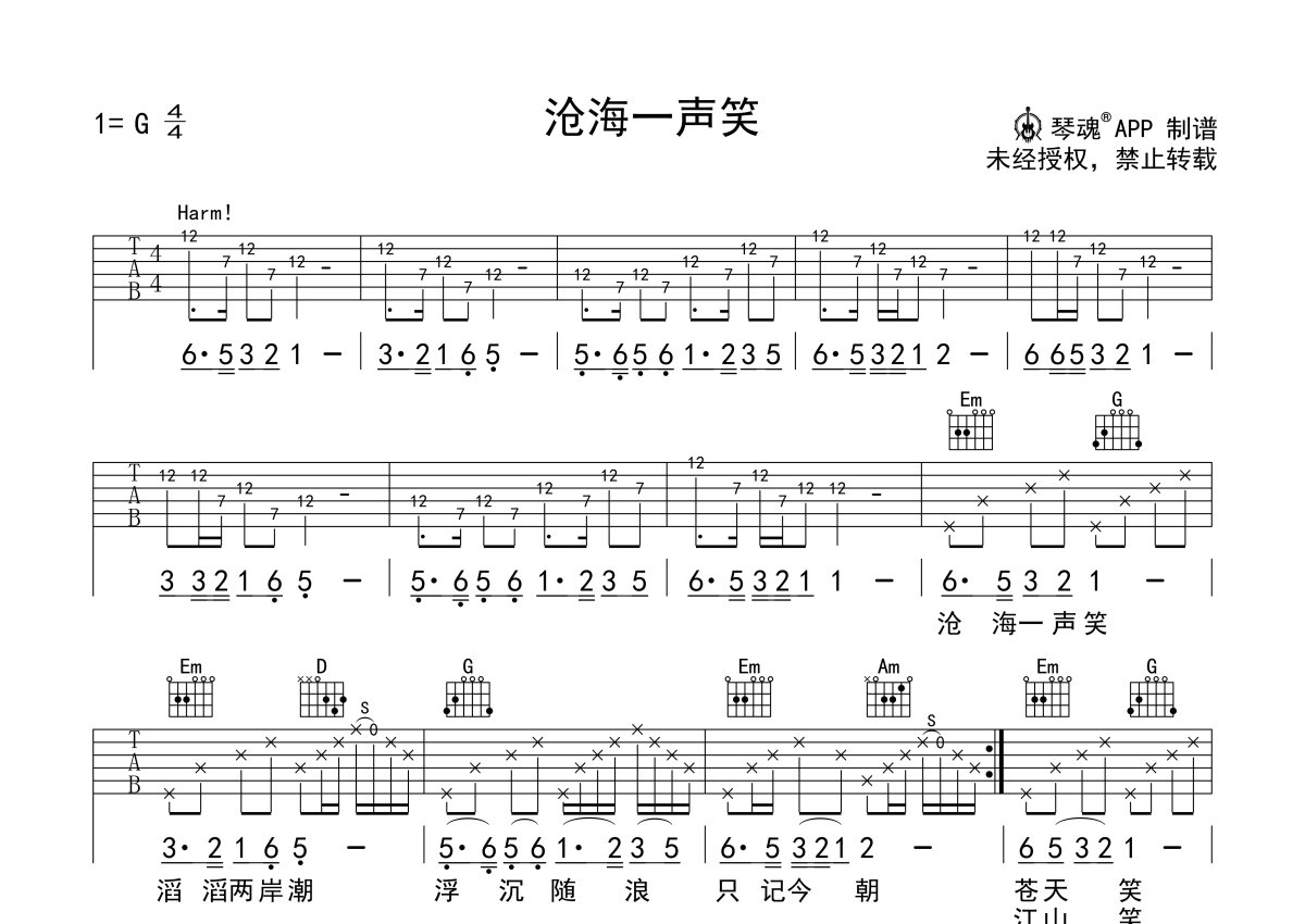 《沧海一声笑》是许冠杰演唱的一首歌曲,泛音前奏,本吉他谱采用的是G调指法编配,这份吉他谱共有一张高清图谱,图谱由 @随心谱 编配上传,图谱使用六线谱编配,包含吉他和弦指法、简谱以及歌词部分,使用这份沧海一声笑吉他谱,可以让你更加方便地掌握这首歌曲的弹唱技巧,快来尝试吧。沧海一声笑吉他谱许冠杰G调高清弹唱谱。