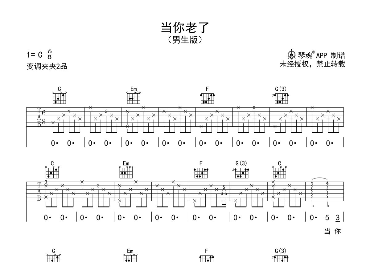 《当你老了》是赵照演唱的一首歌曲,男声版,本吉他谱采用的是C调指法编配,这份吉他谱共有两张高清图谱,图谱由 @随心谱 编配上传,图谱使用六线谱编配,包含吉他和弦指法、简谱以及歌词部分,使用这份当你老了吉他谱,可以让你更加方便地掌握这首歌曲的弹唱技巧,快来尝试吧。赵照《当你老了》吉他谱,六线谱简单弹唱版本,选用C调弹奏变调夹夹第2品。根据叶芝名句改编的这首温暖的歌曲。唱出了很多子女对于母亲的心声。