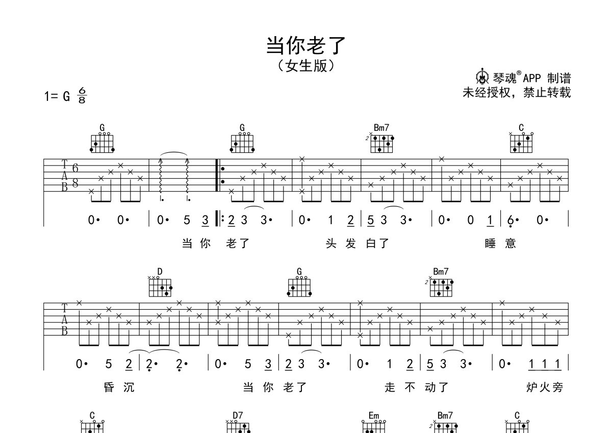 《当你老了》是赵照演唱的一首歌曲,本吉他谱采用的是G调指法编配,这份吉他谱共有两张高清图谱,图谱由 @随心谱 编配上传,图谱使用六线谱编配,包含吉他和弦指法、简谱以及歌词部分,使用这份当你老了吉他谱,可以让你更加方便地掌握这首歌曲的弹唱技巧,快来尝试吧。G调简单女生版 赵照《当你老了》吉他弹唱六线谱。