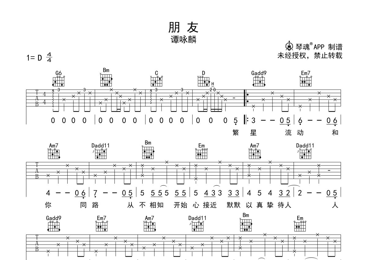 谭咏麟《朋友》吉他谱 - D调弹唱六线谱
