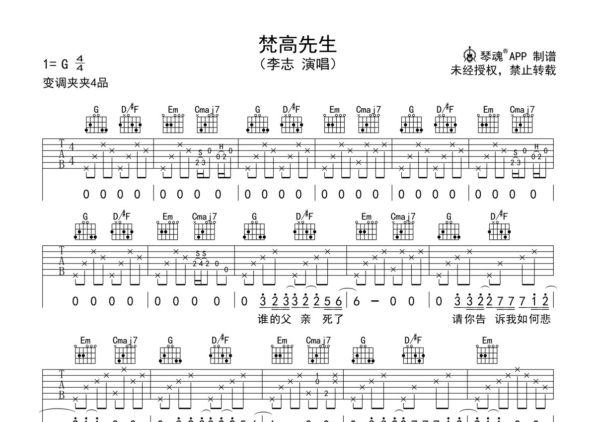 《梵高先生》是南京市民演唱的一首歌曲,本吉他谱采用的是G调指法编配,这份吉他谱共有两张高清图谱,图谱由 @随心谱 编配上传,图谱使用六线谱编配,包含吉他和弦指法、简谱以及歌词部分,使用这份梵高先生吉他谱,可以让你更加方便地掌握这首歌曲的弹唱技巧,快来尝试吧。Capo夹四品,这是逼哥在独孤落魄的时光中创作的一首代表作品,唱出了李志对这个世界最平凡的爱,让我们在感伤的歌声里,体味到那一丝的安慰与温存。