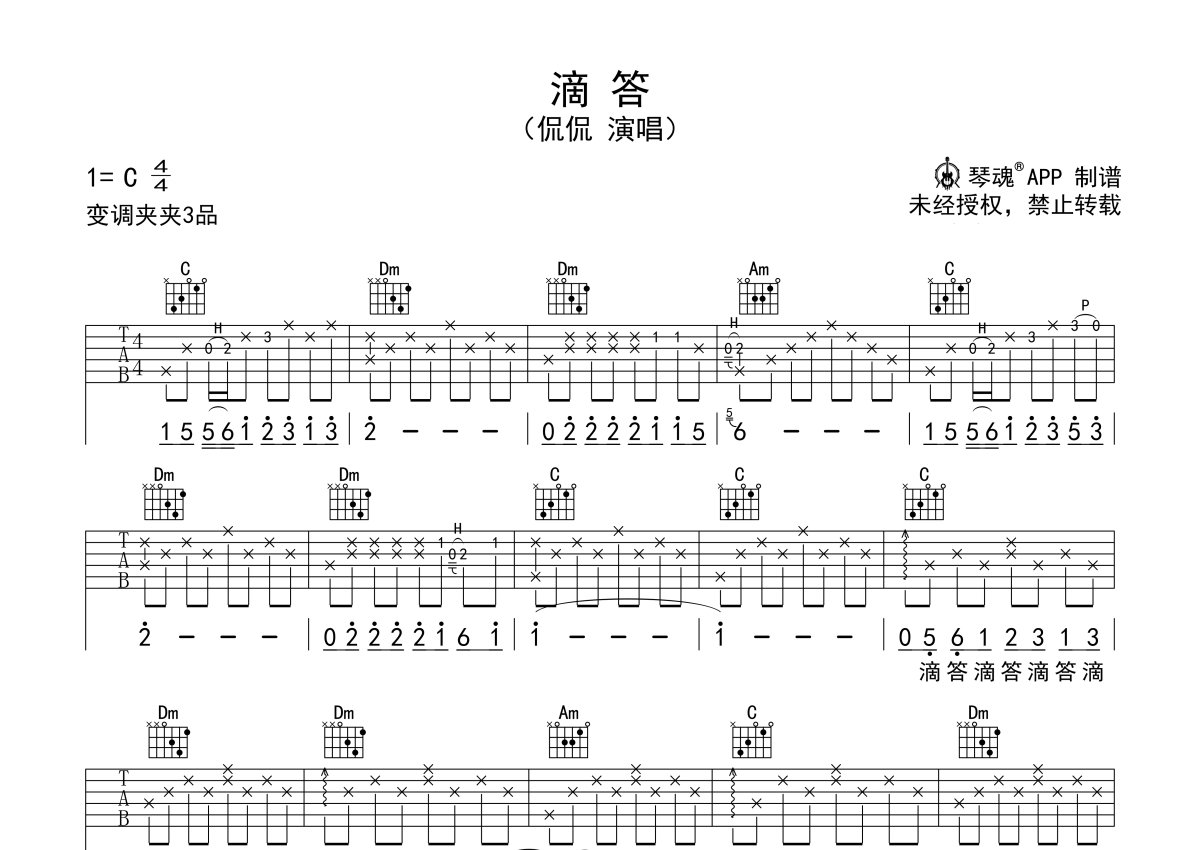 侃侃《滴答》吉他谱 - C调弹唱六线谱 - 新手入门曲