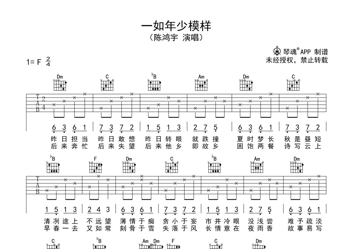 《一如年少模样》是陈鸿宇演唱的一首歌曲,本吉他谱采用的是F调指法编配,这份吉他谱共有两张高清图谱,图谱由 @随心谱 编配上传,图谱使用六线谱编配,包含吉他和弦指法、简谱以及歌词部分,使用这份一如年少模样吉他谱,可以让你更加方便地掌握这首歌曲的弹唱技巧,快来尝试吧。一如年少模样吉他谱,陈鸿宇演唱,F调弹唱谱,《一如年少模样》是陈鸿宇17年新专里最爱的一首歌。尝过了世间百态,人情冷暖,看透之后,仍然一如年少的模样。世间往往不乏看尽世态炎凉后,对一切抱以消极失望态度的人,也不乏逃避遁世之人,最少的就是能够在品尝过人生百味后,仍然能够以一颗赤子之心去面对所有的已知和未知。