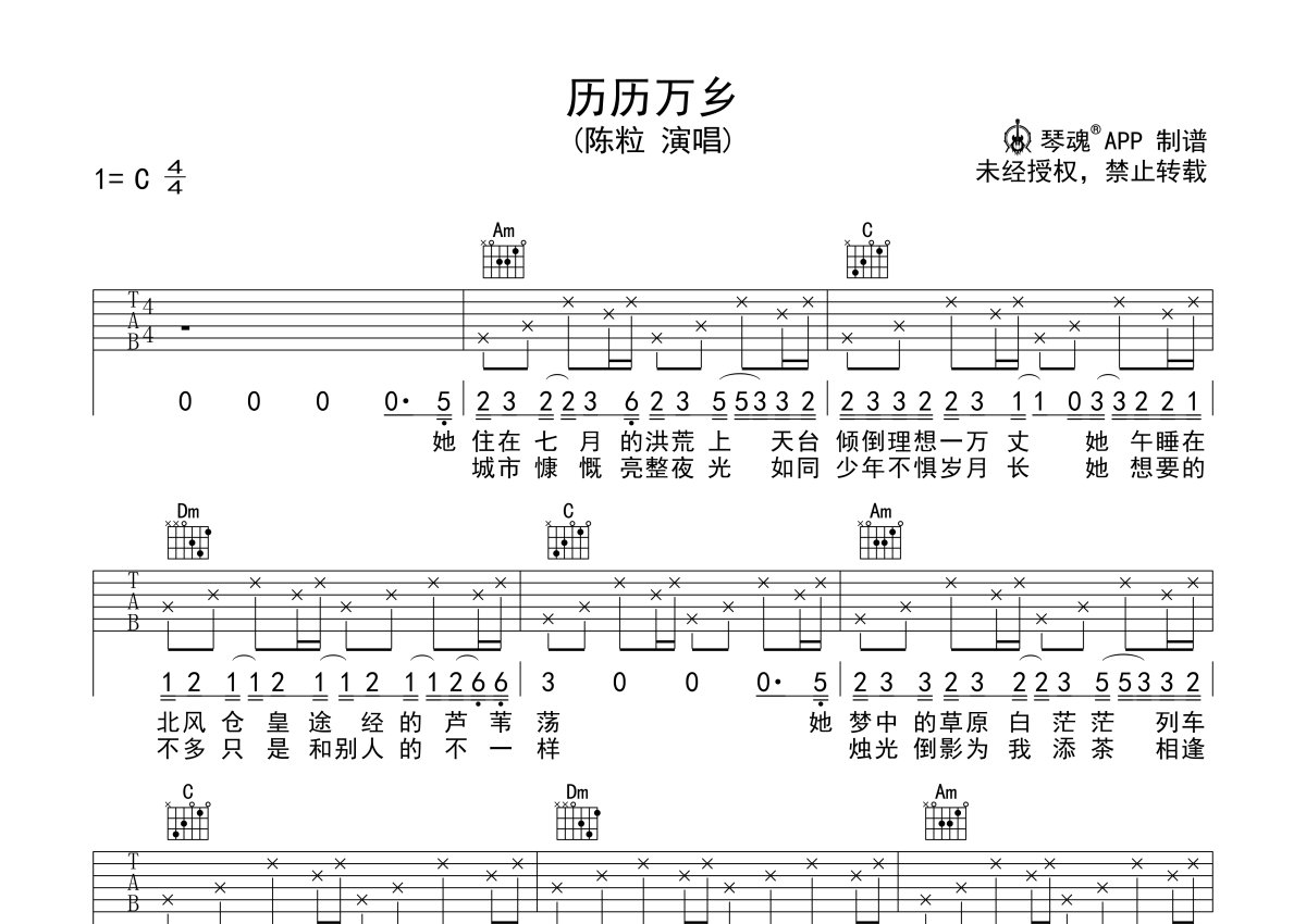 陈粒《历历万乡》吉他谱 - C调弹唱六线谱
