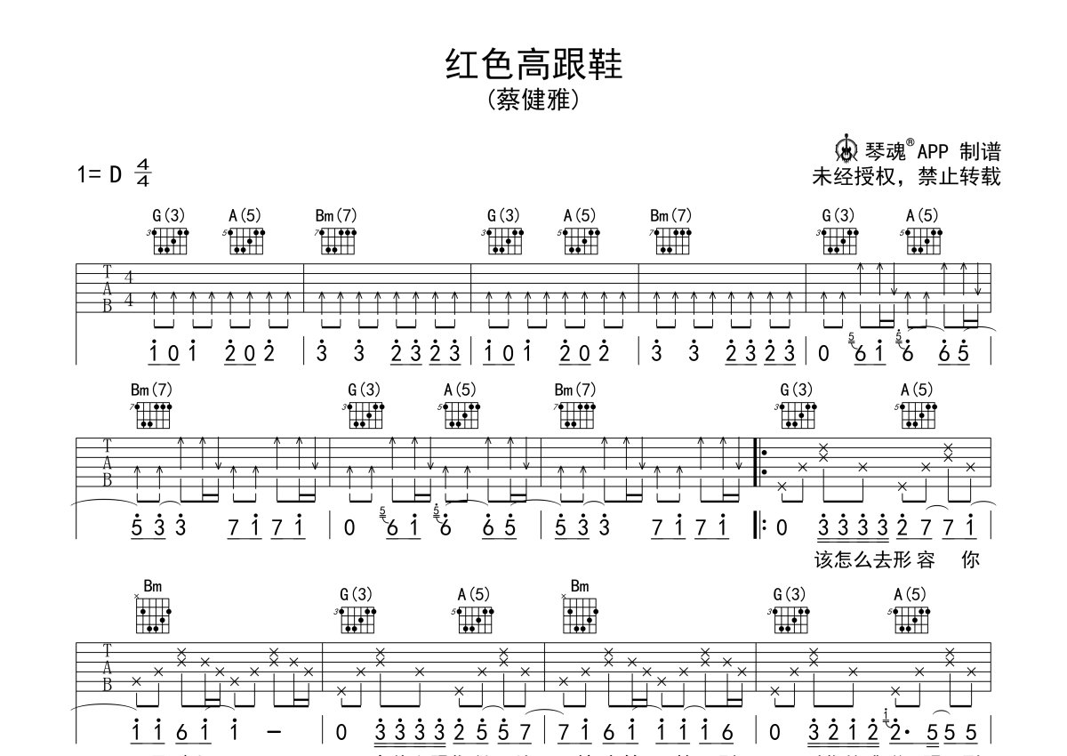 蔡健雅《红色高跟鞋》吉他谱 - D调弹唱六线谱