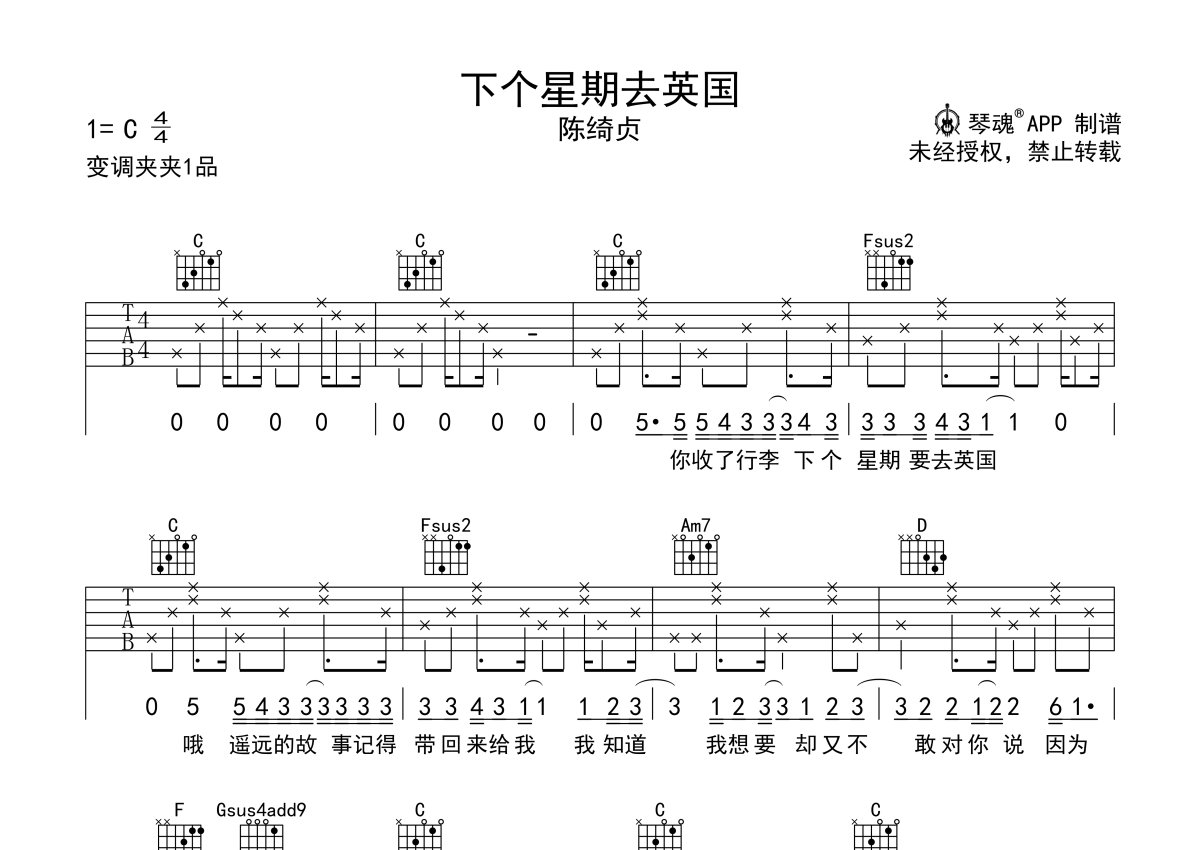 《下个星期去英国》是陈绮贞演唱的一首歌曲,本吉他谱采用的是C调指法编配,这份吉他谱共有两张高清图谱,图谱由 @随心谱 编配上传,图谱使用六线谱编配,包含吉他和弦指法、简谱以及歌词部分,使用这份下个星期去英国吉他谱,可以让你更加方便地掌握这首歌曲的弹唱技巧,快来尝试吧。陈绮贞《下个星期去英国》吉他谱,C调弹唱谱,变调夹夹一品,简单的歌词和旋律,加上苏苏清新的嗓音,仿佛歌里故事就发生在你我身边。陈绮贞的歌声总会让人觉得世界是一团温柔的水。我看着你成长,看着你离别,看着你走向新的世界——其实只是朝着不在预知里的方向旅行而已。