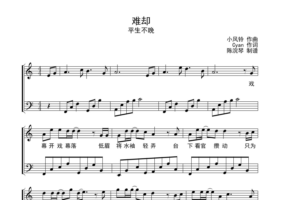 《难却》是平生不晚演唱的一首歌曲,C调钢琴谱,附歌词,难度简单,这份钢琴谱共有两张高清图谱,图谱由 @月隐云先知 编配上传,使用这份难却钢琴谱,可以让你更加方便地掌握这首歌曲的演奏技巧,快来尝试吧。