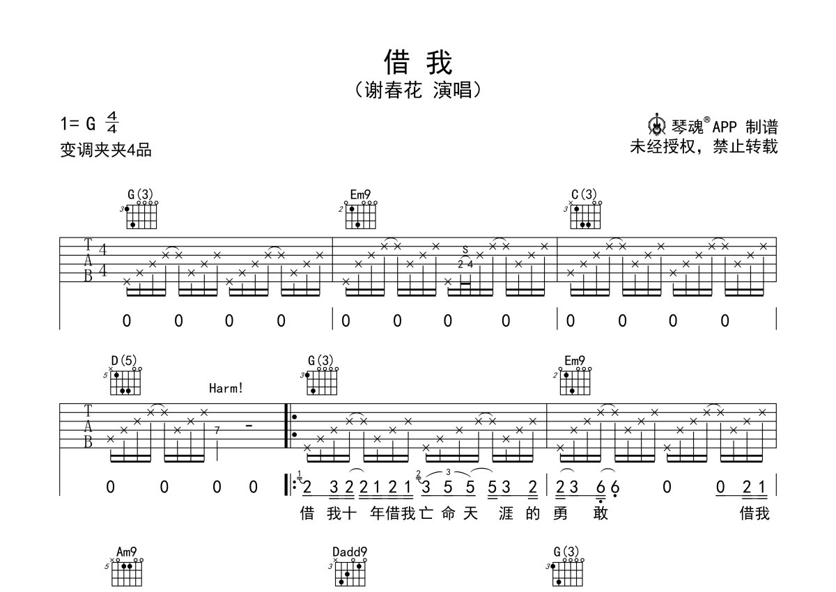 《借我》是谢春花演唱的一首歌曲,本吉他谱采用的是G调指法编配,这份吉他谱共有两张高清图谱,图谱由 @随心谱 编配上传,图谱使用六线谱编配,包含吉他和弦指法、简谱以及歌词部分,使用这份借我吉他谱,可以让你更加方便地掌握这首歌曲的弹唱技巧,快来尝试吧。变调夹夹四品,这是谢春花个人首张专辑《算云烟》中的第二首歌,今年听过的最让人心醉的民谣,歌词中一句“静看光阴荏苒,不管不顾不问不说也不念”,旋律淡淡,歌词简单却深邃,声音平静悠扬,如同在耳边慢慢倾诉。细细聆听,竟愁肠百转,不知所然。借我十年,借我青春年华与年少情怀。