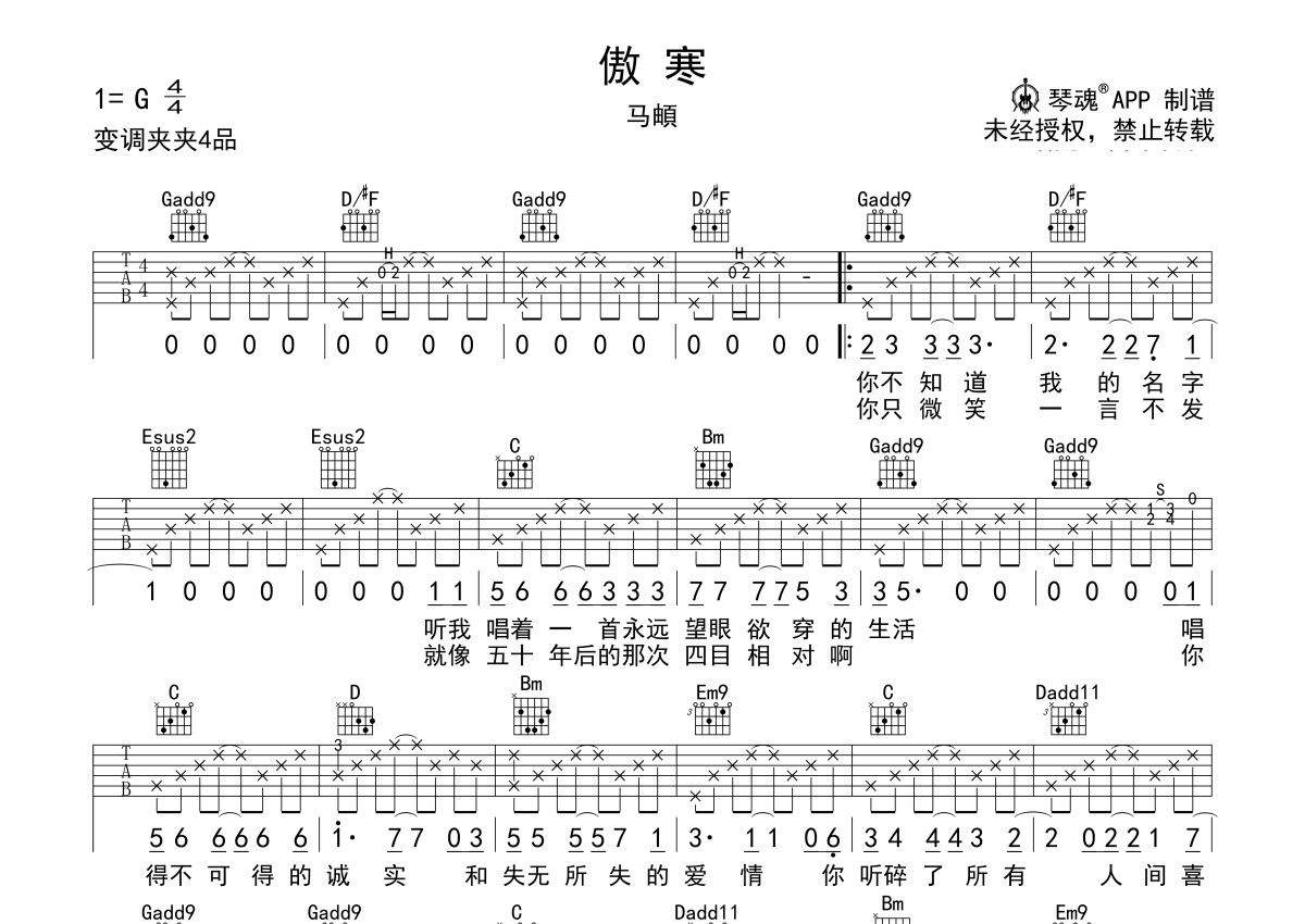 马頔《傲寒》吉他谱 - G调弹唱六线谱