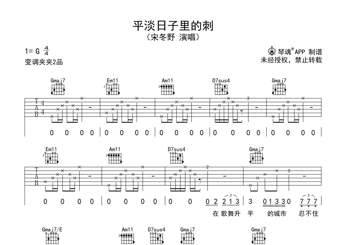 《平淡日子里的刺》是宋冬野演唱的一首歌曲,本吉他谱采用的是G调指法编配,这份吉他谱共有两张高清图谱,图谱由 @随心谱 编配上传,图谱使用六线谱编配,包含吉他和弦指法、简谱以及歌词部分,使用这份平淡日子里的刺吉他谱,可以让你更加方便地掌握这首歌曲的弹唱技巧,快来尝试吧。G调变调夹夹第二品,电影《我想和你好好的》主题曲,宋冬野作曲韩寒填词的一首旋律流畅平缓的歌曲,沙哑的声线唱出爱情幻灭。那些始终的信仰,那些纯粹的爱情,真是平淡如尘,却也是珍贵如玉。而现实如何逃避平淡,平淡是真,躁动是刺。我们总不自觉的拿刺去折磨生活,折磨自己,折磨我们爱的人。