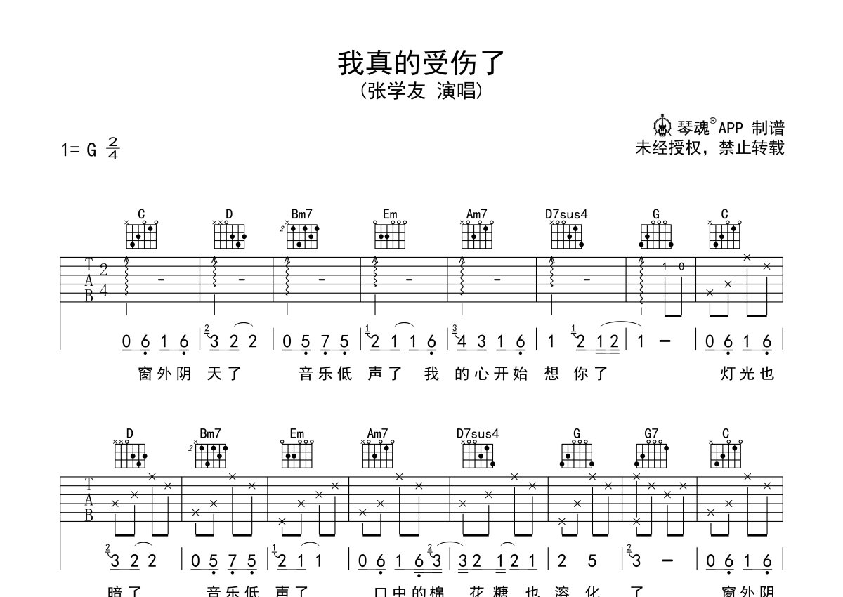 张学友《我真的受伤了》吉他谱 - G调弹唱六线谱