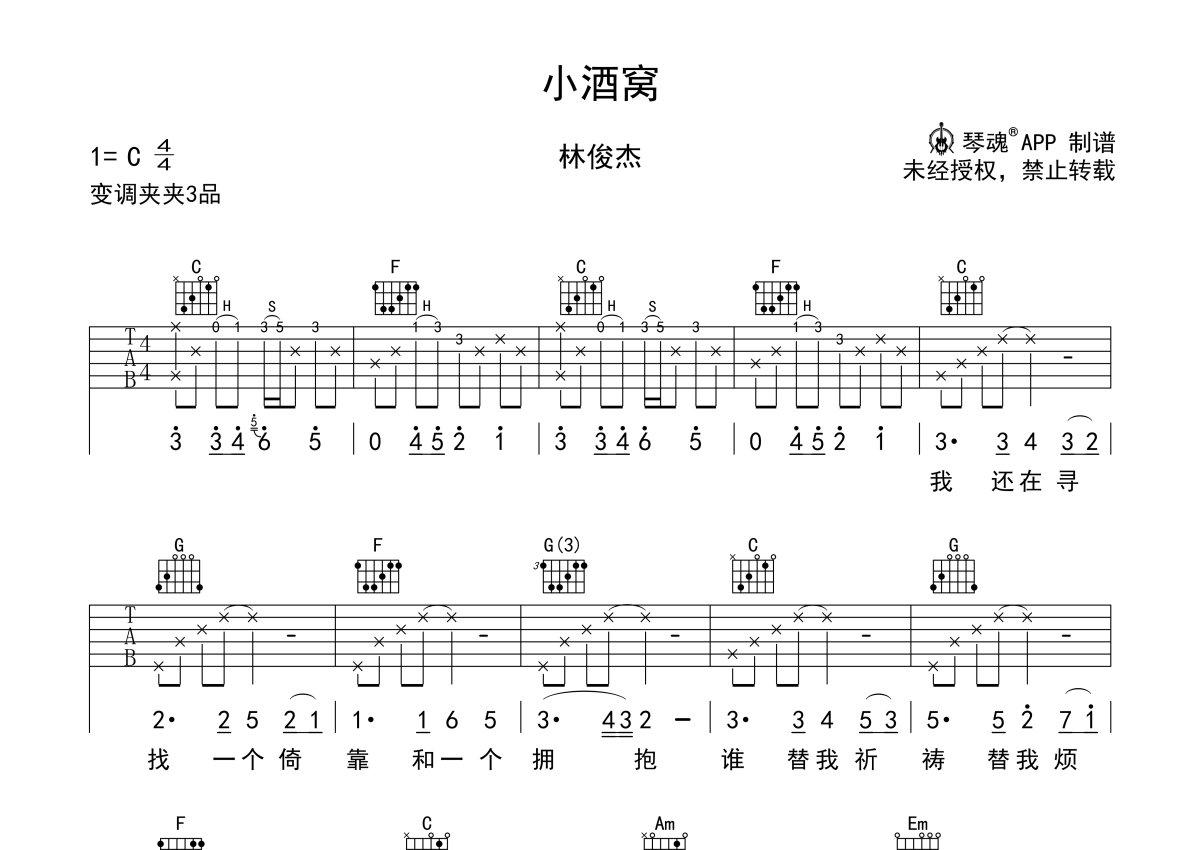 《小酒窝》是林俊杰演唱的一首歌曲,完美版,本吉他谱采用的是C调指法编配,这份吉他谱共有两张高清图谱,图谱由 @随心谱 编配上传,图谱使用六线谱编配,包含吉他和弦指法、简谱以及歌词部分,使用这份小酒窝吉他谱,可以让你更加方便地掌握这首歌曲的弹唱技巧,快来尝试吧。变调夹夹三品。这是林俊杰和蔡卓妍的一首男女经典对唱金曲,唱出了恋爱男女心有灵犀的甜蜜美好,和幸福的味道。