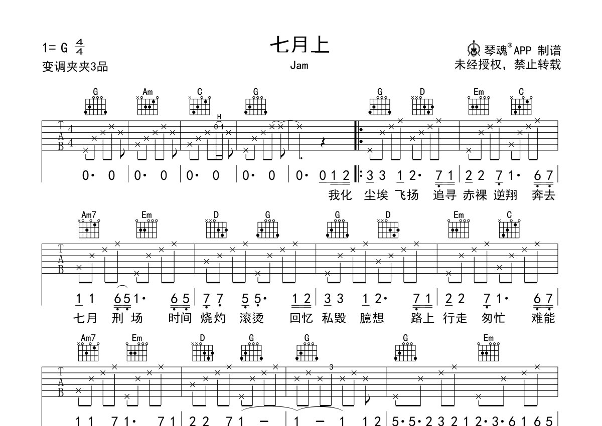 Jam《七月上》吉他谱 - G调弹唱六线谱