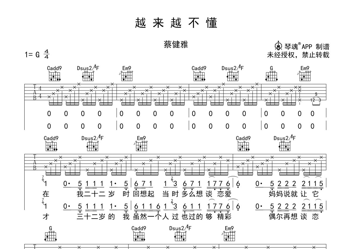 《越来越不懂》是蔡健雅演唱的一首歌曲,本吉他谱采用的是G调指法编配,这份吉他谱共有两张高清图谱,图谱由 @随心谱 编配上传,图谱使用六线谱编配,包含吉他和弦指法、简谱以及歌词部分,使用这份越来越不懂吉他谱,可以让你更加方便地掌握这首歌曲的弹唱技巧,快来尝试吧。这首歌曲唱出了对现代爱情的洒脱,同时也反映了一个人生活的自在,没恋爱的人赶紧来感受一下。
